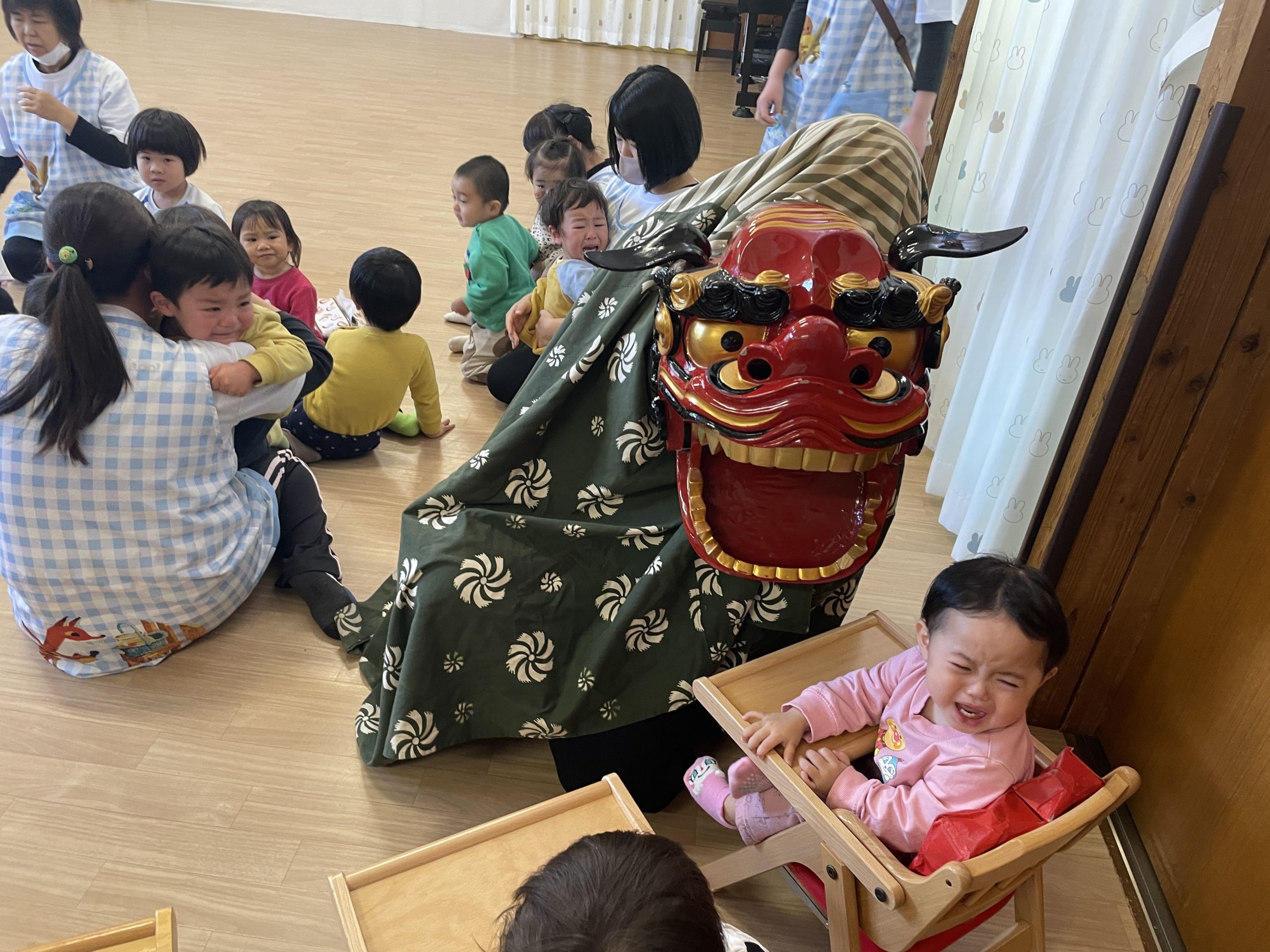 乳児クラスは、泣いてしまう子、ししまいを見つめる子など様々でしたが、最後は、仲良く記念撮影ができました。